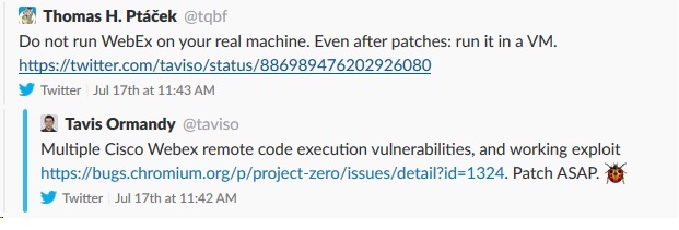 The latest round of Cisco WebEx vulnerabilities produced a lot of the same advice. Patch now, make sure you are patched, please patch etc… you know the usual advice. Then I come across this on my feed: